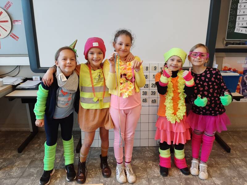 Onze fluo-flits carnavalsdag kon niet meer stuk. We hielden een modeshow, stelden onze carnavalsklasgenoot voor aan de hand van een raadselschrijftaak, klonken op de overwinning en gingen fuiven op de fluo-flitsfuif.