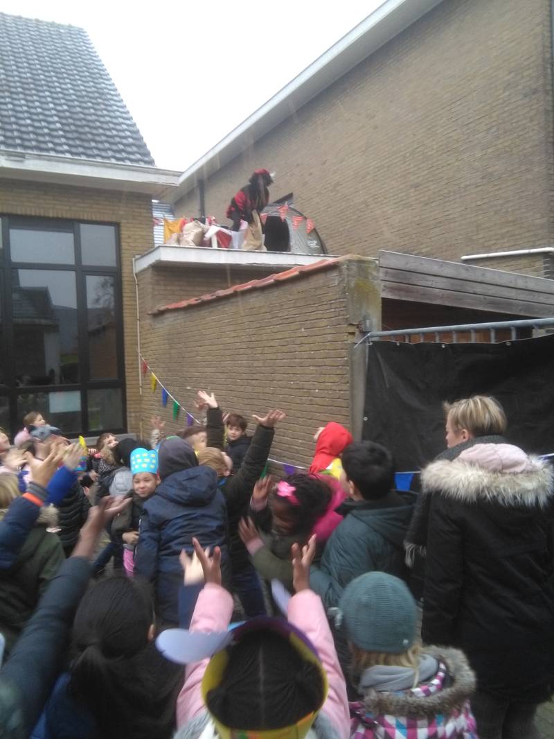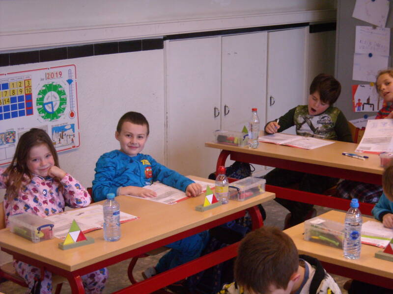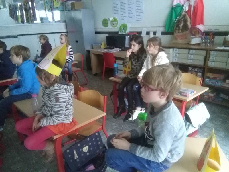 Groot bezoek vandaag op school : Rond 9u kwam Sint alleen aan. Hij was op zoek naar Piet. Deze lag te slapen in zijn tentje op het dak van onze school en ja hij had zich overslapen. We zongen voor Sint en Piet, we kregen een chocolade figuur, nic-nacjes en een super lekkere mandarijn. In onze klaszak zaten heel wat leesboekjes een film en een brief. Door de drukte in de drukkerij zijn nog heel wat boekjes verloren gegaan. We mogen binnen enkele dagen een postpak verwachten op school. Onze namiddag brachten we gezellig samen door voor de film 'De verenkoning' . Onze klas leek een echte cinema waar je buiten het geknabbel aan letterkoekjes een muisje (figuurlijk) kon horen lopen. We hebben echt genoten van deze super fantastische dag!