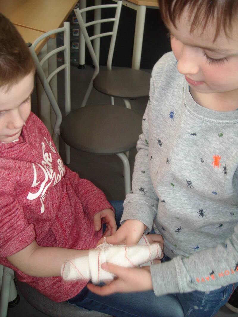 Op donderdag 21 maart leerden kregen we een korte instructie rond EHBO door verpleegster Ines. We leerden hoe we iemand die flauw gevallen is kunnen helpen, een schaaf- en snijwonde verzorgen. Hoe we een bloedneus kunnen stoppen, wat we moeten doen als we ons verbrand hebben. De opvolging is verzekerd, want zelfs tijdens het leggen van verbanden zagen we hier en daar een verpleegster of verpleger in wording. Kijk maar even mee.